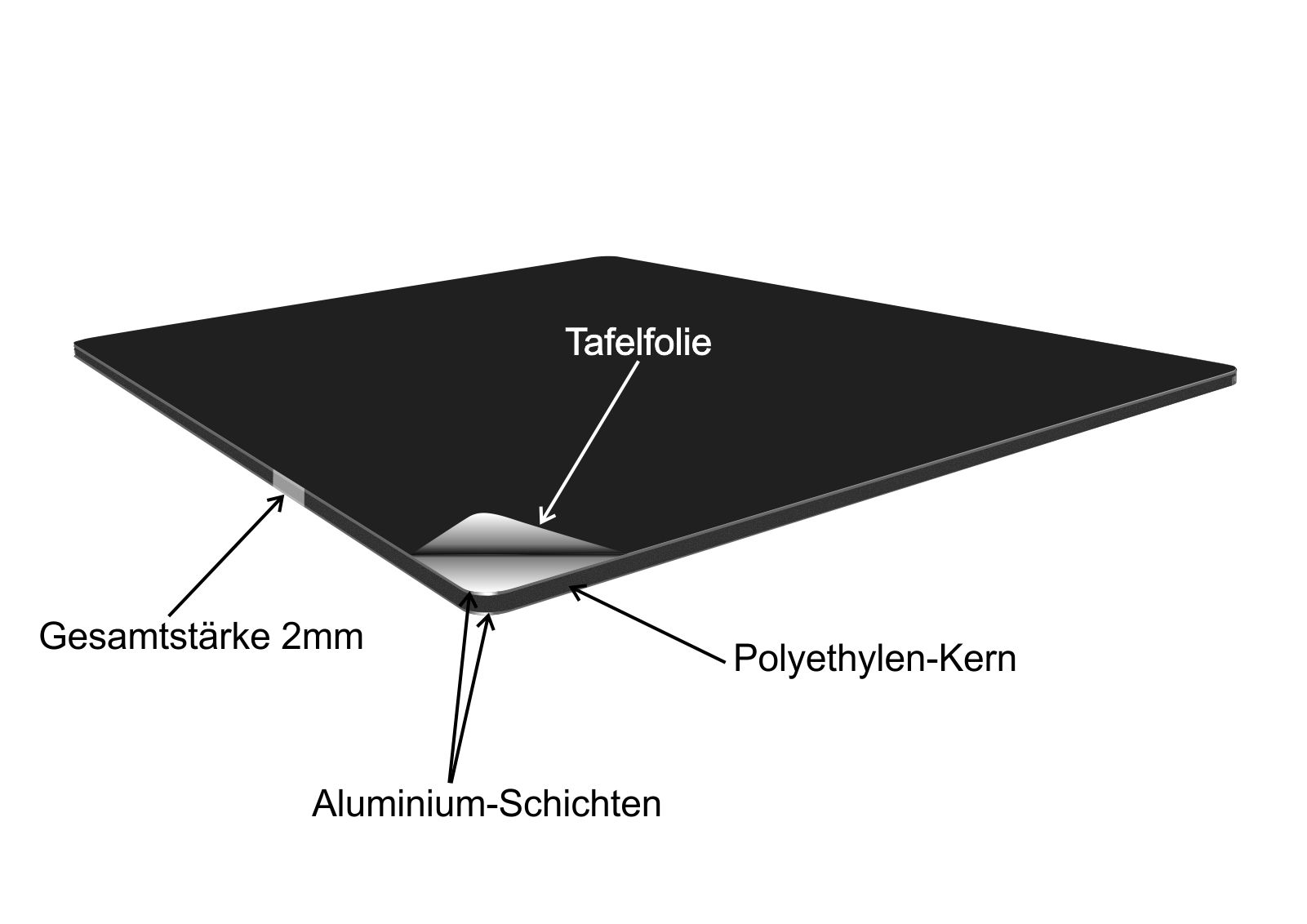 Sie erhalten Ihre Tafel aus einer 2mm starken Aluminium-Verbundplatte. Aluverbundplatten bestehen aus einem Polyethylen-Kern und sind beidseitig mit Aluminium-Schichten versehen.